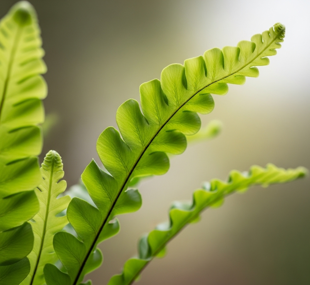 Features more elongated, rippled fronds that cascade outwards, creating a graceful, flowing effect. - Asplenium antiquum (Japanese Bird’s Nest Fern):