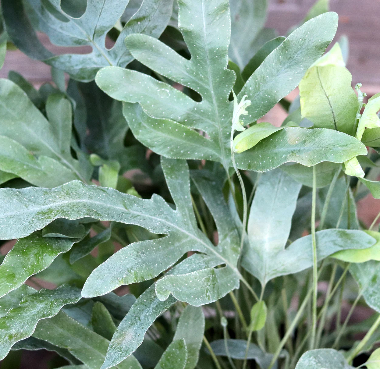 A marvel of nature, this fern’s fronds curl and shrivel during dry spells, appearing dead, only to unfurl and green up vibrant green again with moisture. Native to humid subtropical regions, it’s often seen growing on oak trees. - Phlebodium aureum (Blue Star Fern):