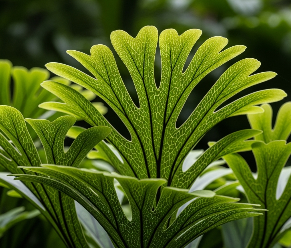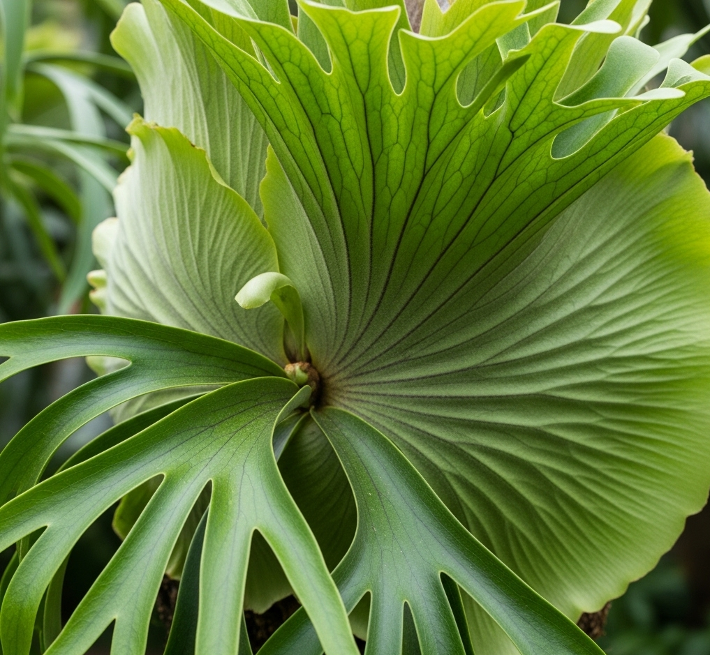 Recognizable by its deeply lobed, veined shield fronds that resemble an elephant’s ear. This is a more challenging species that thrives in very high humidity and specific care. - Platycerium wandae (Queen Staghorn):
