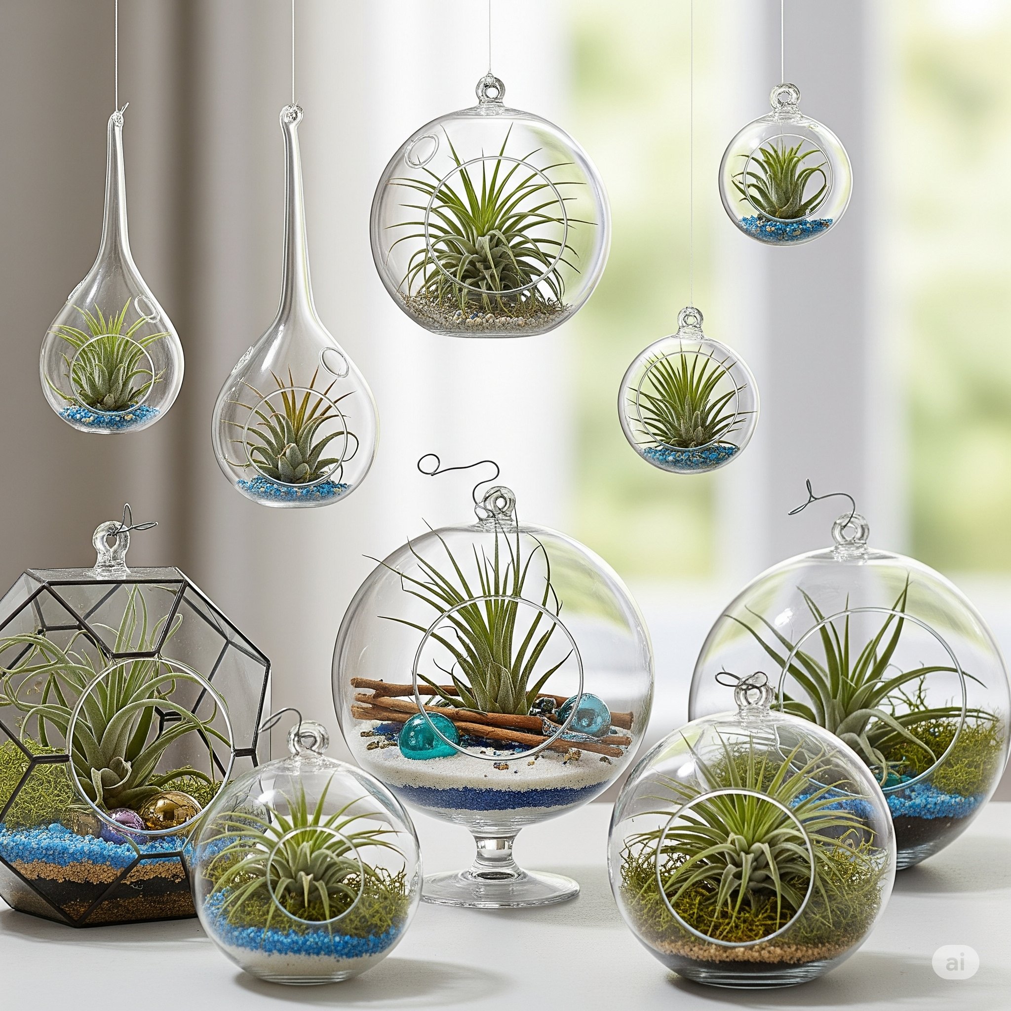 Place them inside glass orbs or terrariums for a minimalist, modern look that complements your decor beautifully. Just be sure there is enough air flow to maintain their health and vitality! This approach not only enhances the visual appeal of your space but also creates a serene atmosphere, perfect for any setting. - Hanging Displays: